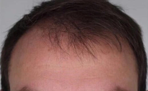 Alopécie androgénétique progressive suivie d'une greffe de cheveux et d'un comblement des zones clairsemées.