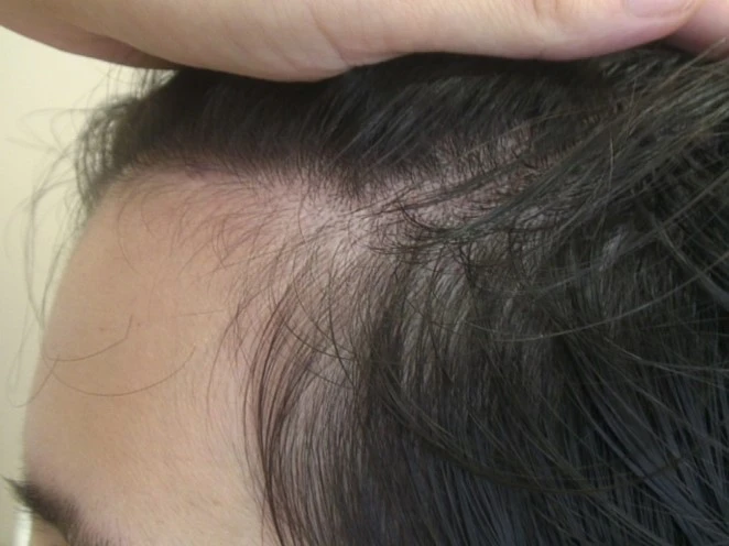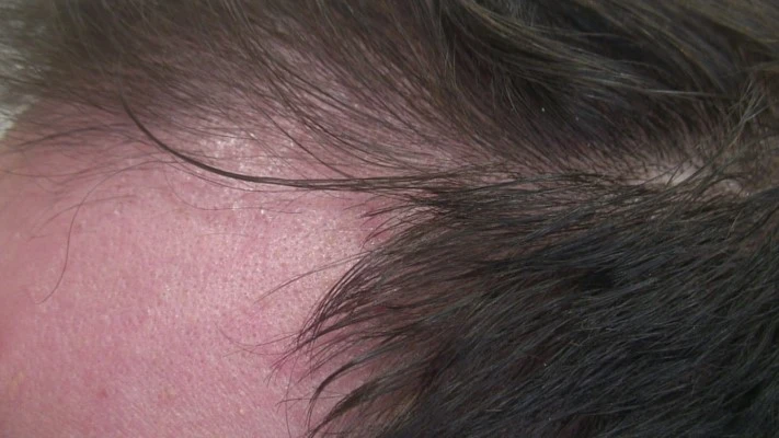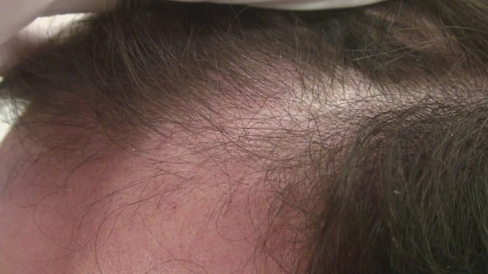 Nella fase iniziale, compare una tipica chiazza calva nella zona della fronte con una progressiva stempiatura, che si sviluppa nella cosiddetta testa calva del monaco.