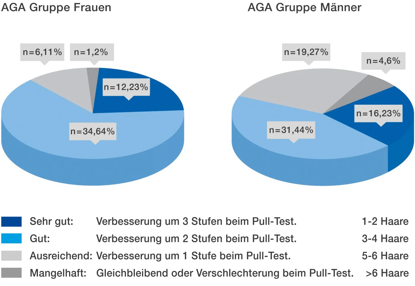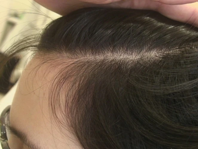 Nelle donne, la progressione è più moderata: i capelli si diradano tipicamente nell'area della corona. Non c'è calvizie, ma piuttosto un evidente diradamento dei capelli.